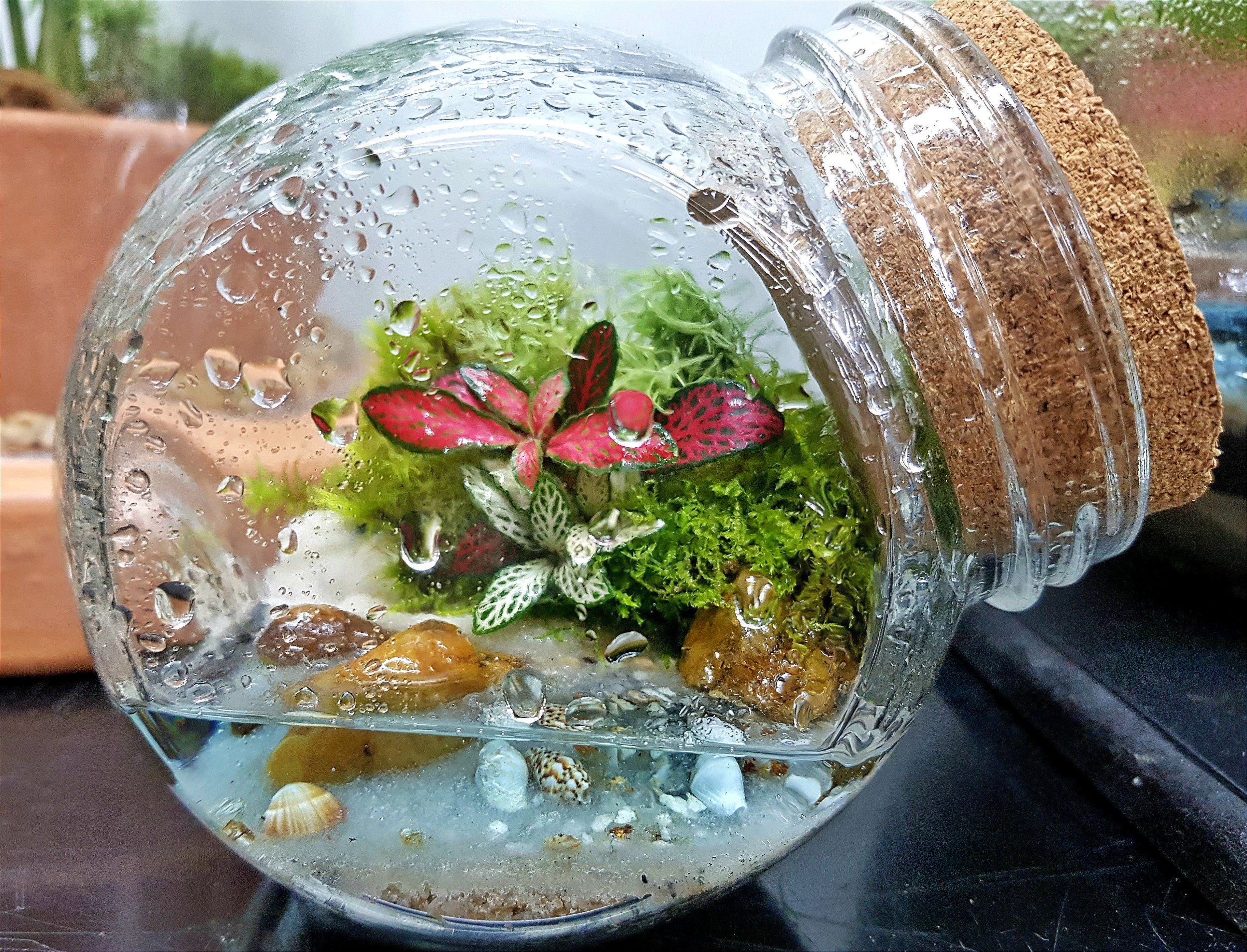 Um mini-mundo dentro de um mini-baleiro, com um laguinho na frente, fechado com uma rolha de cortiça e que cabe na palma da sua mão.